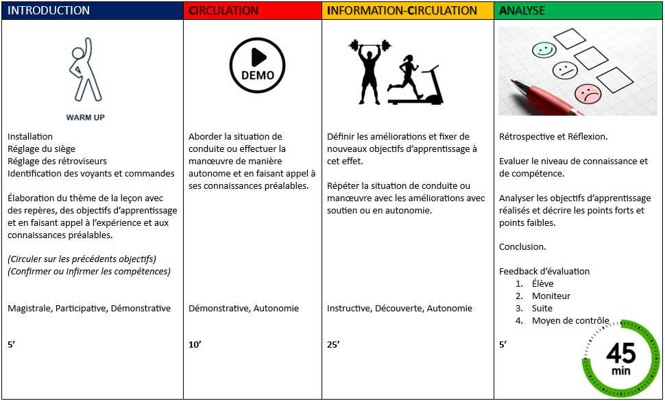 Structure d'une leçon de conduite. Elle sera toujours adaptée au niveau de formation et à la phase d'apprentissage de l'élève.
